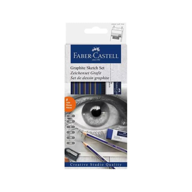 GOLDFABER GRAPHITE SKETCH SET. This 8 piece set contains one pencil each of the grades 6B 4B 2B B HB and 2H plus a single metal sharpener and a dust free art eraser packed in a hang sell cardboard box. |