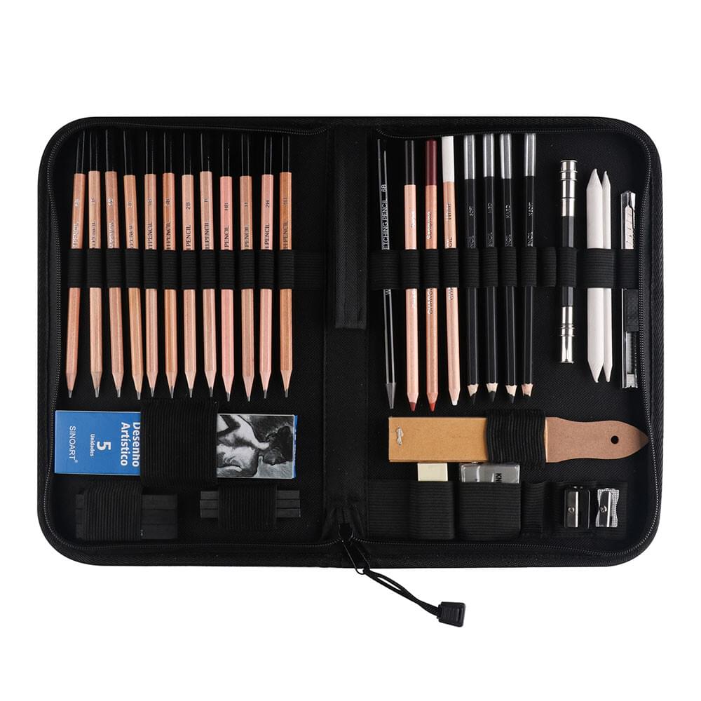 Sinoart Sketching Art Case: A comprehensive sketching set containing 12 grades of graphite sketching pencils, 4 grades of black charcoal pencil, 3 coloured charcoal pencils, 5 sticks of natural charcoal, 3 grades of compressed charcoal blocks, 3 grades of graphite blocks, 2 paper stumps, 1 each of plastic & metal pencil sharpeners, plastic & kneaded eraser plus a pencil extender with sandpaper block and retractable blade knife for sharpening. Packed in a zippered travel/storage case.