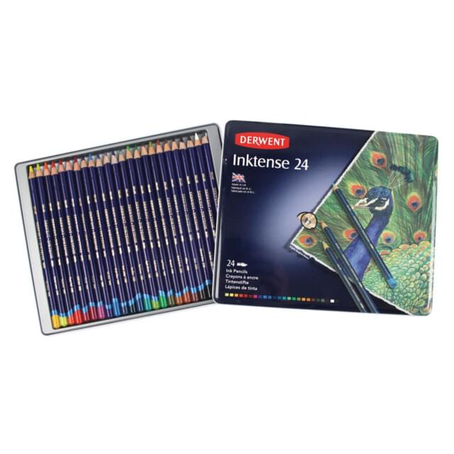 DERWENT INKTENSE WATERCOLOUR PENCIL TIN 24 Assorted Colours. One each of sherbet lemon, sun yellow, tangerine, poppy red, chilli red, shiraz, fuschia, violet, iris blue, bright blue, deep indigo, sea blue, teal green, apple green, field green, leaf green, mustard, baked earth, willow, bark, charcoal grey, ink black, antique white and outliner. |