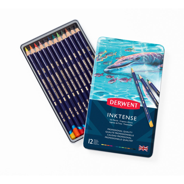 DERWENT INKTENSE WATERCOLOUR PENCIL TIN 12 Assorted Colours. One each of sun yellow, tangerine, poppy red, fuschia, deep indigo, sea blue, teal green, apple green, leaf green, baked earth, bark and ink black. |