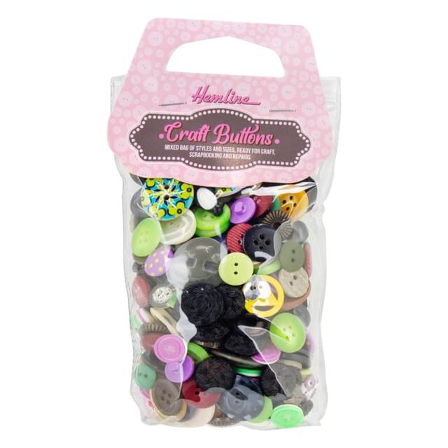 PLASTIC ASSORTED CRAFT BUTTONS 200g BAG. A classroom assortment of approximately 450 plastic buttons in a variety of colours, shapes and sizes for all creative and craft applications. |