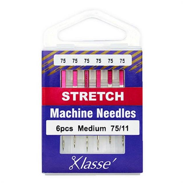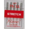 NEEMST075 NEEMST075 KLASSE STRETCH MACHINE NEEDLE #75 PACK OF 6. These Klasse stretch machine needles are designed especially for 2 way stretch knits such as lycra, jersey, spandex and highly elastic synthetic fabrics to prevent skipped stitches. They feature rounded points that penetrate between fabric threads rather than pierce them. The stretch needle point is slightly less rounded than a ballpoint machine needle point. In stock Login For Price
