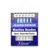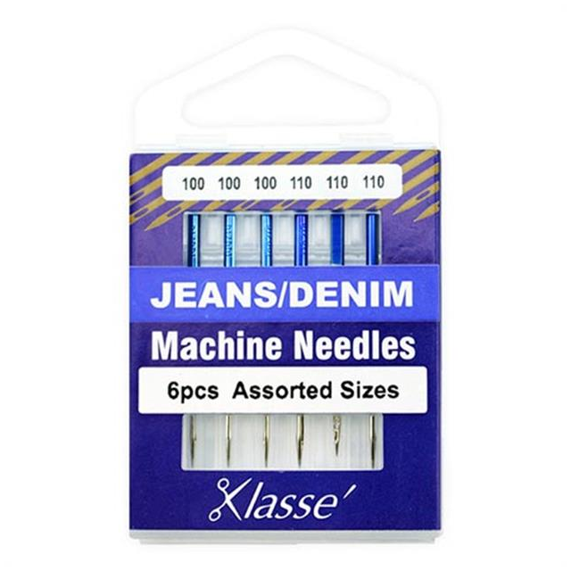 NEEMJEAS6 NEEMJEAS6 KLASSE JEANS MACHINE NEEDLE PACK OF 3 EACH SIZE 100 & 110. For heavyweight denim, canvas, upholstery fabrics, artificial leather and vinyl. This needle features a deeper scarf, an acute point and modified shaft to sew without pushing fabric down into needle-plate hole. Penetrates through the fabric and meets the bobbin hook better on dense woven fabrics. In stock Login For Price