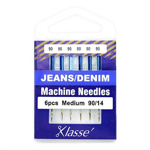 NEEMJE090 NEEMJE090 KLASSE JEANS MACHINE NEEDLE #90 PACK OF 6. For heavyweight denim, canvas, upholstery fabrics, artificial leather and vinyl. This needle features a deeper scarf, an acute point and modified shaft to sew without pushing fabric down into needle-plate hole. Penetrates through the fabric and meets the bobbin hook better on dense woven fabrics. In stock Login For Price