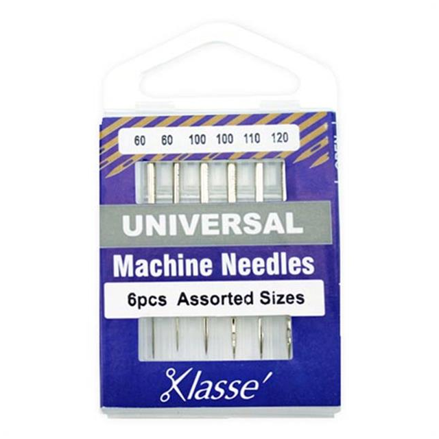 NEEMUNAS6 NEEMUNAS6 KLASSE UNIVERSAL MACHINE NEEDLES PACK 6 ASSORTED SIZES. The assortment contains 2 each sizes 60 &100 plus one each size 110 & 120 of these all-purpose machine needles that feature slightly rounded points to penetrate the fabric threads of woven fabrics. Suitable for 99% of all domestic sewing machines and a wide variety of woven and knitted fabrics. In stock Login For Price