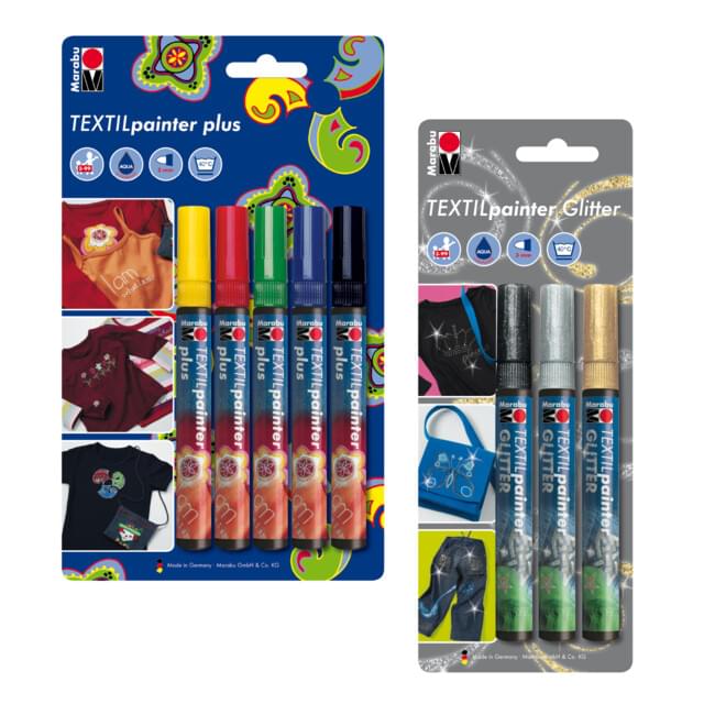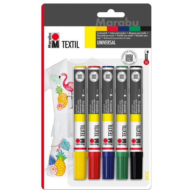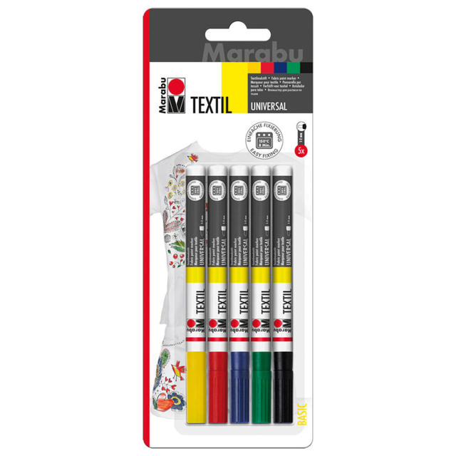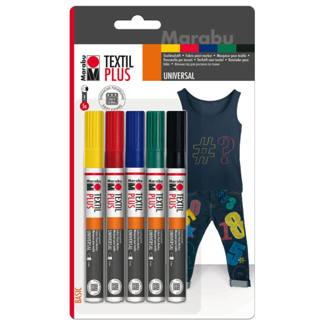 MC118000 MC118000 MARABU TEXTIL PAINTER PLUS 3mm SET OF 5. Contains one each yellow, cherry red, dark green, dark blue and black. In stock Login For Price