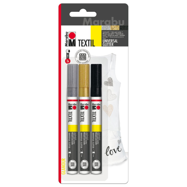 MC119000 MC119000 MARABU TEXTIL PAINTER GLITTER 3mm SET OF 3. Contains one each of glitter black, glitter silver and glitter gold. In stock Login For Price