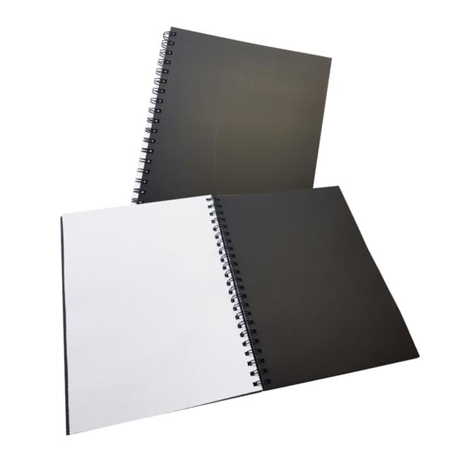 The Black and White Photo Diaries features alternate sheets each of blank white 110gsm cartridge paper for illustrations and text plus 140gsm black mounting cartridge paper for photos etc. Double spiral wire binding together with a printable black polypropylene cover and heavy boxboard back cover.