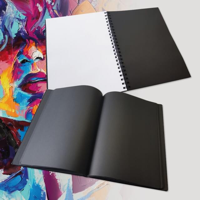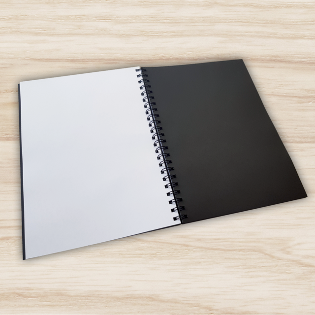 The black paper photo diaries are single spiral wire bound and feature a durable black PVC cover and a heavyweight boxboard base filled with 45 sheets (90 pages) of black 110gsm or 125gsm acid-free paper.