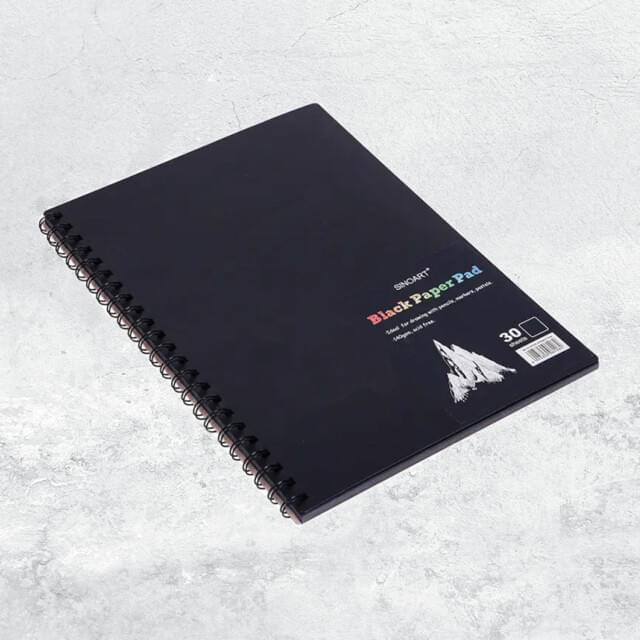 SINOART SPIRAL BLACK PAPER PAD/DIARY A3. Diary contains 30 sheets (60 pages) of 140gsm acid-free sketching/drawing paper with double spiral wire binding with black poly cover. |
