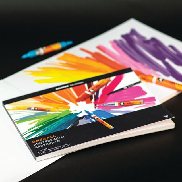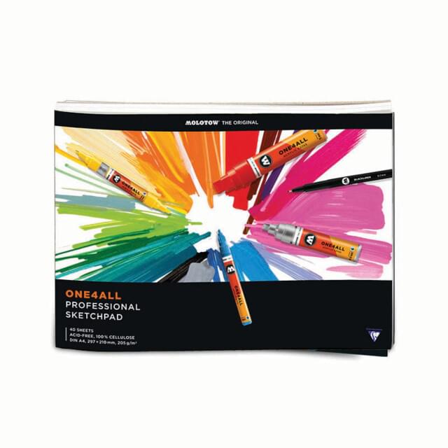 MOLOTOW ONE-4-ALL A4 PROFESSIONAL SKETCH PAD.This optimised professional quality pad features smooth, stable, acid-free surface paper suitable for acrylic, water and alchohol-based markers and spray cans, Eco and vegan-friendly fabrication containing 40 sheets of pure 100% cellulose, white paper for all mixed-media projects. |