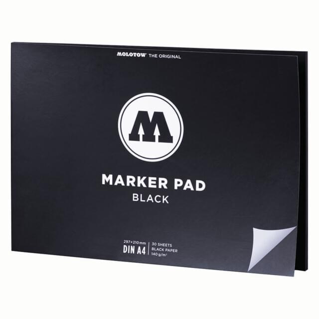 MOLOTOW A4 BLACK MARKER PAD LANDSCAPE. These pads feature acid-free, 100% cellulose, professional quality black paper. The smooth and stable surface is perfectly suitable for acrylic, water and alcohol-based markers. Eco and vegan friendly. Each pad contains 30 sheets of 140gsm paper. |