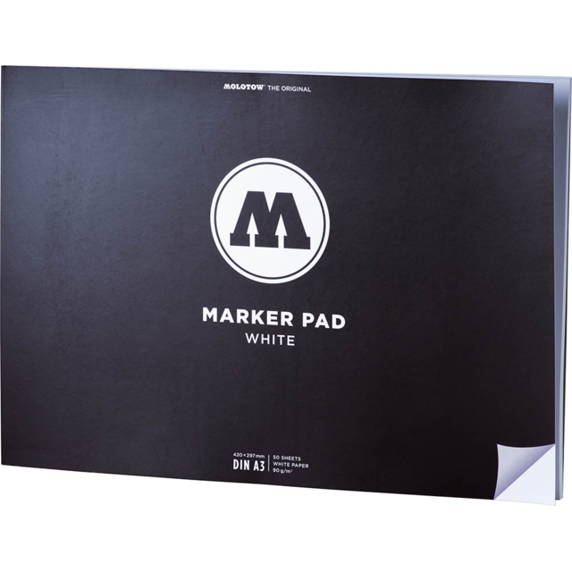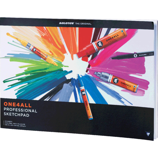 MOLOTOW ONE-4-ALL A3 PROFESSIONAL SKETCH PAD.This optimised professional quality pad features smooth, stable, acid-free surface paper suitable for acrylic, water and alchohol-based markers and spray cans, Eco and vegan-friendly fabrication containing 40 sheets of pure 100% cellulose, white paper for all mixed-media projects. |