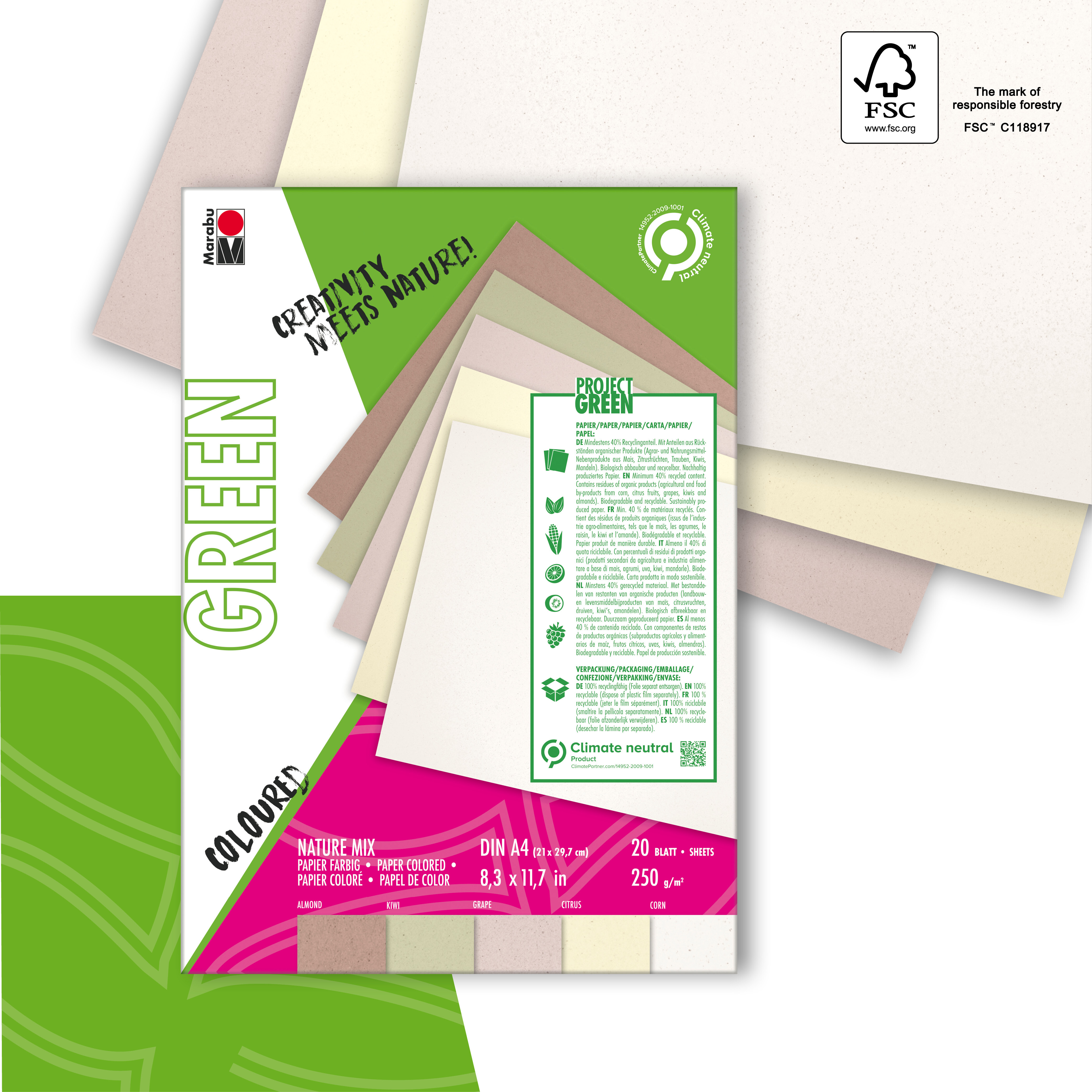 MARABU GREEN 250g 40% RECYCLED A4 PAD-5 COLOURS. Recycled, coloured, matt paper with a textured surface that is sustainably produced, biodegradable, recyclable and FSC certified. Contains 20 sheets of 250gsm 40% recycled paper. 4 sheets each of Almond, Kiwi, Grape, Citrus and Corn coloured paper. |