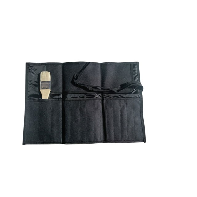*BRUSH ROLL WRAP -BLACK NYLON. Made from a durable nylon fabric which house the brushes neatly with a fold-over flap to protect the brush tips and other tools. A neat easy way to transport your equipment. |