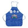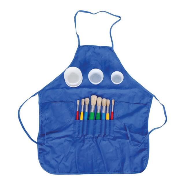 This set includes 2 each of 4 different size, coloured, short stubby handled, hog hair brushes, a lidded water pot plus 2 paint pots and colourful canvas apron with neck loop and waist ties.