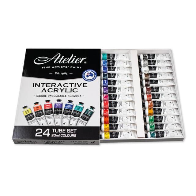 ATELIER INTERACTIVE 24x20ml ARTISTS TUBE BOX SET. Contains one 20ml tube each of Titanium White, Arylamide Yellow Light, Arylamide Yellow Deep , Quinacridone Magenta, Yellow Ochre, Raw Sienna Dark, Burnt Sienna, Orange, Pyrrole Red, Crimson, Light Red Ochre, Burnt Umber, Raw Umber, Toning Grey Mid, Cerulean Blue Hue, French Ultramarine Blue, Pthalo Blue, Prussian Blue Hue, Cobalt Turquoise Light Hue, Perm Sap Green, Chromium Green Oxide, Pthalo Green, Brilliant Violet, Carbon Black. |