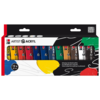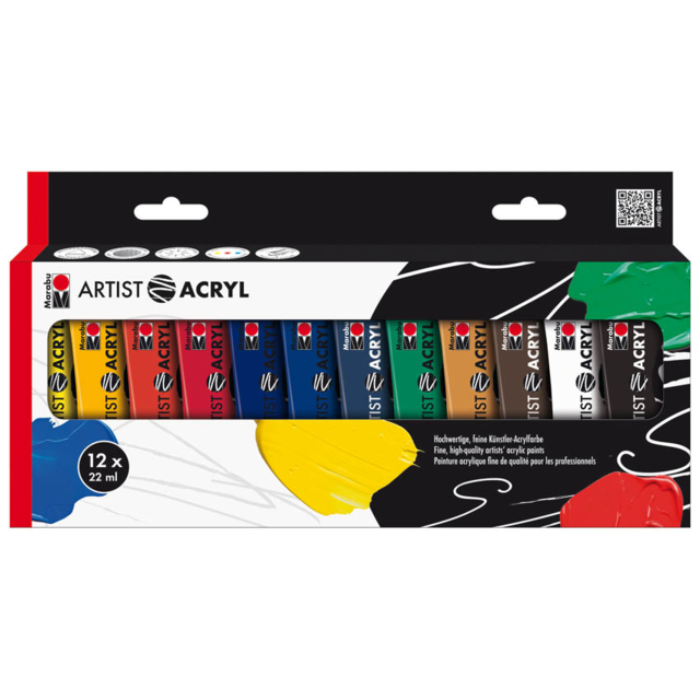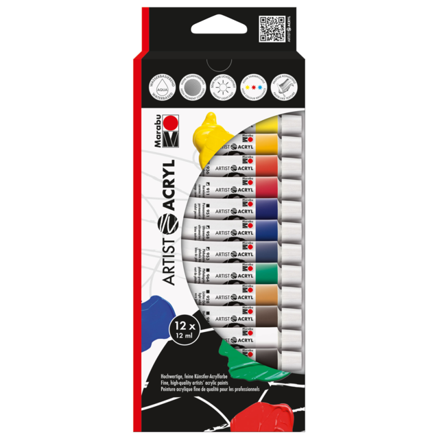 MARABU ARTIST ACRYLIC 12x12ml SET. Contains one 12ml tube each in primary yellow, cadmium yellow deep, vermillion, carmine red, permanent violet, ultramarine blue, phthalo blue, phthalo green light, light (yellow) ochre, burnt umber, titanium white and carbon black. |
