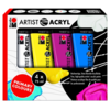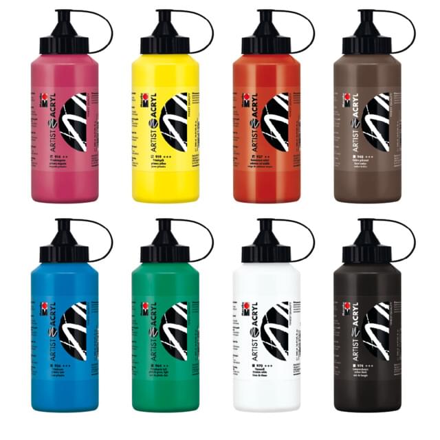 MARABU ARTIST ACRYLIC CLASSROOM SET 8 x 500ml. Contains one 500ml bottle each of magenta, primary yellow, cadmium red medium, burnt umber, primary cyan blue, phthalo green light, titanium white and carbon black. |