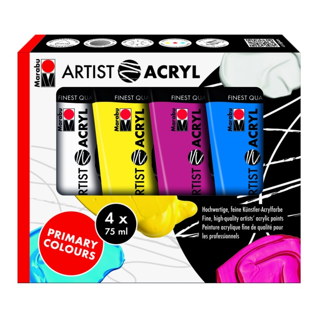*MARABU ARTISTS PRIMARY COLOURS SET 4x75ml. Includes a 75ml tube each of the essential artist primary mixing colours of: primary yellow, primary magenta, cyan blue and titanium white. |