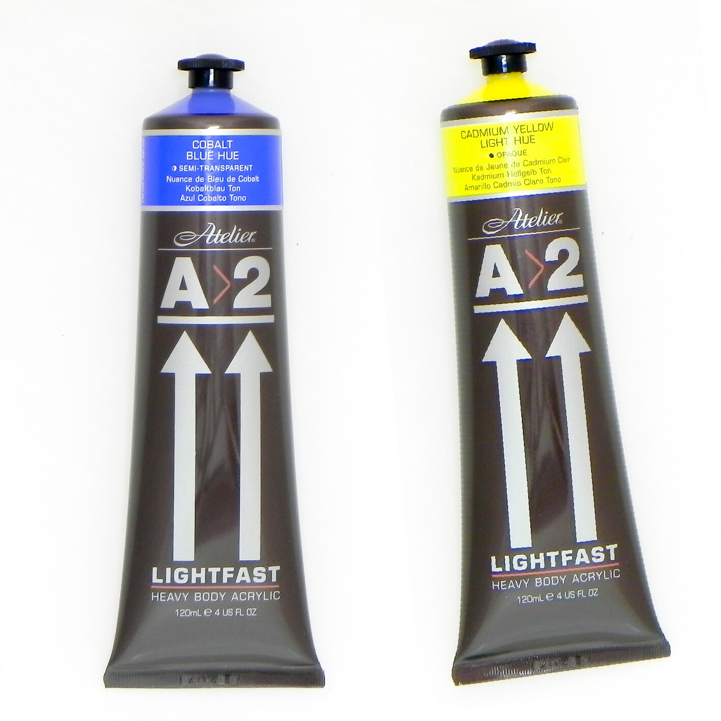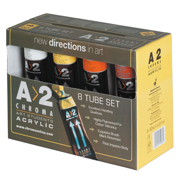 CHROMA A2 STUDENT ACRYLIC BOX SET - 8 x 120ml ASSORTED. Contains 1 x 120ml each: titanium white, cadmium yellow light hue, alizarin crimson hue, phthalo blue, dioxazine purple hue, phthalo green hue, cadmium orange hue and cadmium red medium hue. |