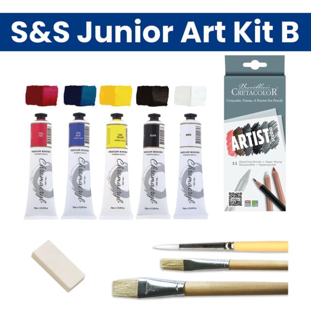 SSJAK2 SSJAK2 S&S JUNIOR ART KIT B (YEARS 7-8). Contains 5 x 75ml Chromacryl Student Acrylic Cool Colours, Size 6 Round Taklon brush, Size 8 & 12 Flat Bristle brushes, Cretacolor Drawing Set 101 and vinyl eraser packed in plastic bag. Available soon Login For Price