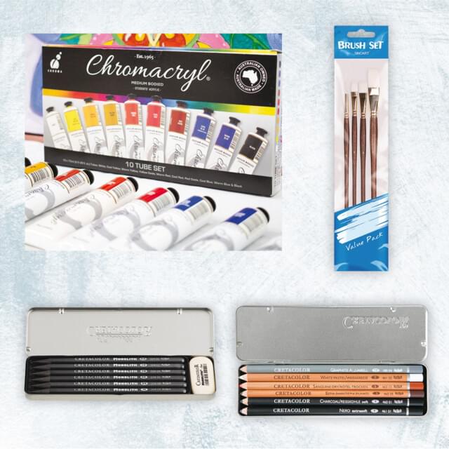 SSSAK2 SSSAK2 S&S SENIOR ART KIT B (YEARS 9-10). Contains 10 x 75ml Chromacryl Student Acrylic Colours, set of 4 Taklon brushes, tin of 6 Cretacolor Monolith woodless graphite pencils and Cretacolor Primo darwing & sketching set packed in plastic bag. Available soon Login For Price