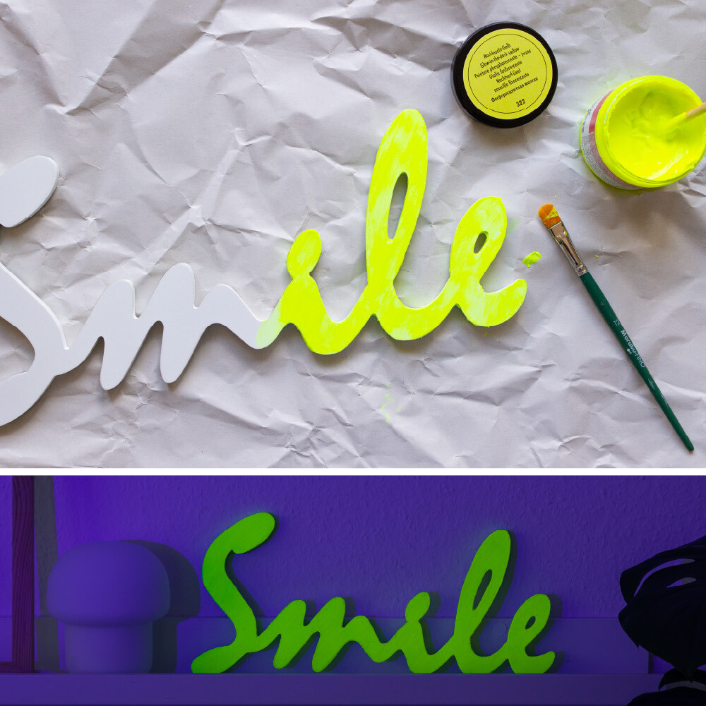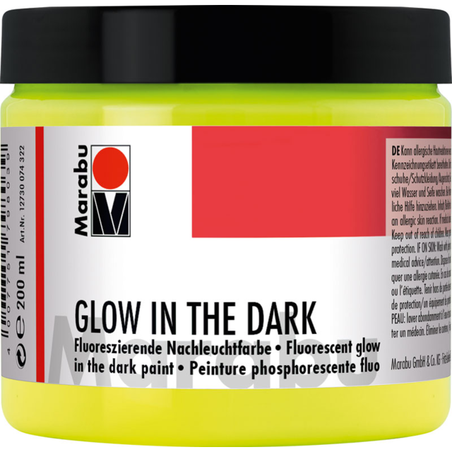 Glazing, fluorescent, water-based glow-in-the-dark paint. The paint glows brightly in the dark or under a UV black light, is smudge proof and has limited non-fade properties. Use on wood, MDF, paper mâché, ceramics, metal, glass and canvas. For best results apply to a light background. Can be applied with a brush, spatula or stencil. Colour looks different in daylight and in the dark.