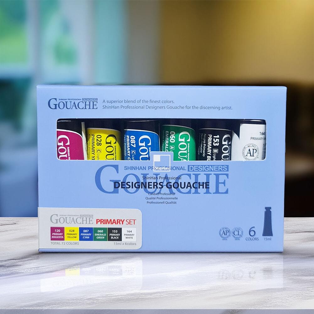 SHINHAN PROFESSIONAL DESIGNERS GOUACHE SET 6x15ml.Contains one 15ml tube each of Primary Magenta, Primary Yellow, Primary Cyan, Emerald Green, Primary Black and Primary White. |