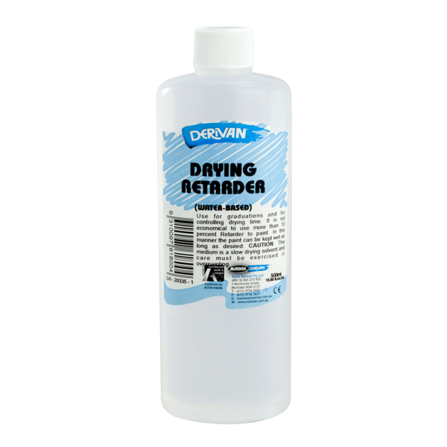 DERIVAN DRYING RETARDER MEDIUM 250ml. This Medium is primarily used to retard or slow the drying time of the paint. Adding up to 3% retarder into the colour will result in a slightly more fluid colour that will stay wet for much longer. The second method is by utilising a hand pumped spray bottle (atomiser) and spray the retarder onto the paint area required to be kept wet.. This Medium is primarily used to retard or slow the drying time of the paint. Adding up to 3% retarder into the colour will result in a slightly more fluid colour that will stay wet for much longer. The second method is by utilising a hand pumped spray bottle (atomiser) and spray the retarder onto the paint area required to be kept wet. |