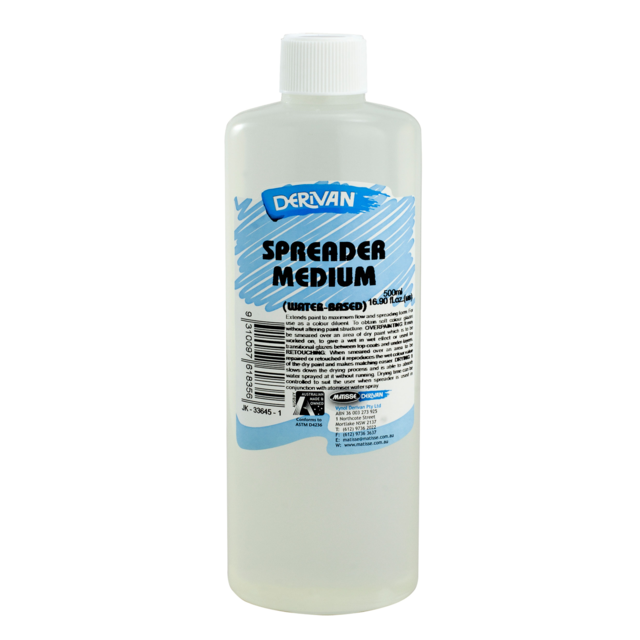 DERIVAN 500ml SPREADER MEDIUM. An all-in-one flow promoter, drying retarder and glazing medium. Effective in watercolour work, multiple layer glazing and for large solid colour areas. |