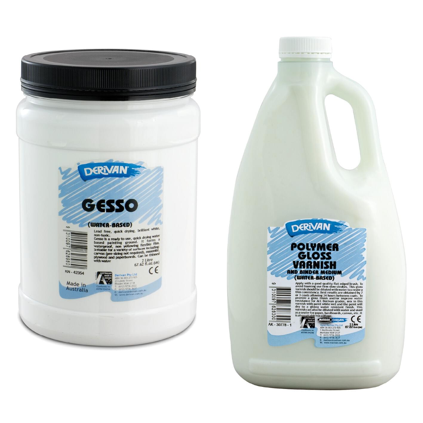 DERIVAN 2 Litre GESSO PRIMER. A very economic primer for canvas or board. Serves as a suitable non-cracking painting ground for acrylics. Low sheen finish with pleasant granular tooth to prevent brush slippage. |