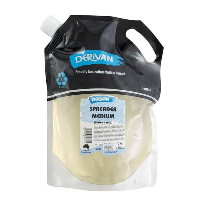 DERIVAN 2 LITRE SPREADER MEDIUM. An all-in-one flow promoter, drying retarder and glazing medium. Effective in watercolour work, multiple layer glazing and for large solid colour areas. |