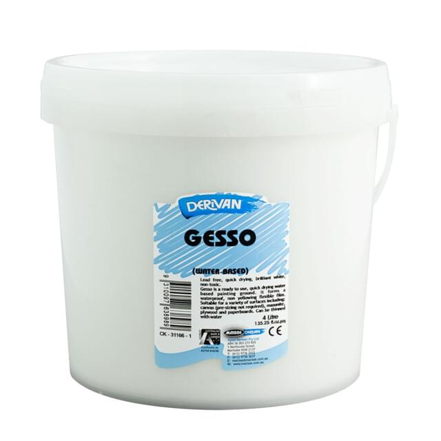 DERIVAN 4 Litre GESSO PRIMER. A very economic primer for canvas or board. Serves as a suitable non-cracking painting ground for acrylics. Low sheen finish with pleasant granular tooth to prevent brush slippage. |