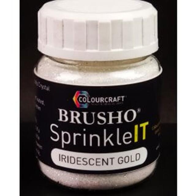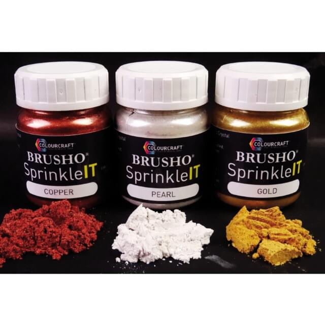 BRUS10AS BRUS10AS BRUSHO SPRINKLE IT 10g x 6 COLOUR ASSORTMENT. One 10gm pack each of metallic gold, metallic copper, metallic pearl, iridescent gold, violet and flash. Available soon Login For Price