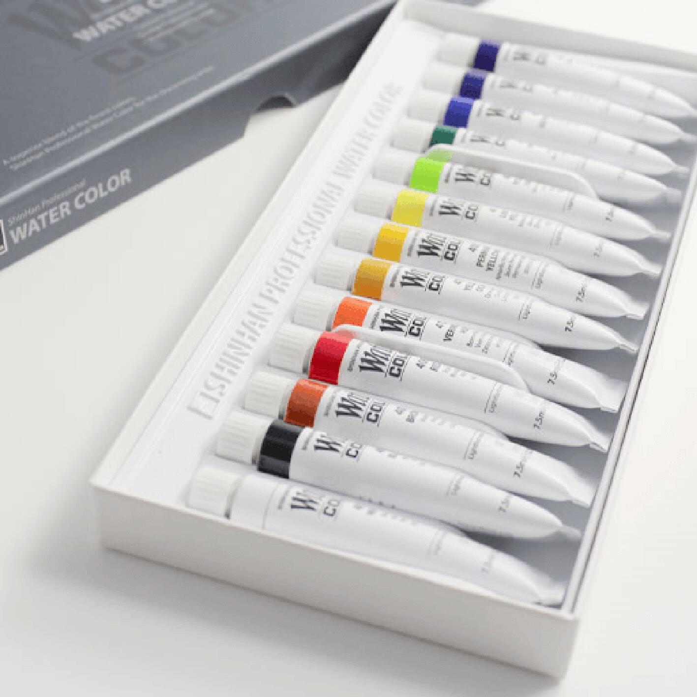 SHINHAN 7.5ml ARTISTS WATERCOLOURS - Set 13 Contains one 7.5ml tube each of white, black, brown, red, vermilion hue, yellow ochre, permanent yellow deep, lemon yellow, yellow green, viridian hue, ultramarine, prussian blue and violet. |
