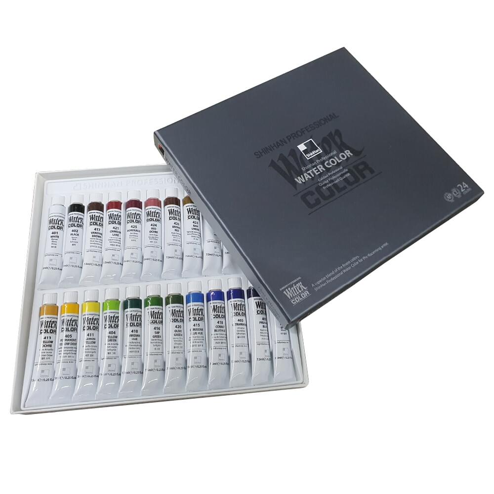 SHINHAN 7.5ml ARTISTS WATERCOLOURS - Set 24 Contains one 7.5ml tube each of white, black, vandyke brown, crimson lake, bordeaux, red ochre, brown red, raw umber, brown, red, vermilion hue, orange, yellow ochre, permanent yellow deep, lemon yellow, yellow green, viridian hue, sap green, olive green, cerulean blue hue, cobalt blue hue, ultramarine, prussian blue and violet. |