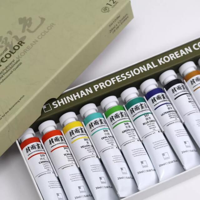 SH1425012 SH1425012 SHINHAN TRADITIONAL KOREAN COLOURS 12x20ml TUBE SET. Contains one tube each of Crimson, Carmine, Vermillion Hue, Yellow Light, Green Light, Blue Green, Opal Green, Prussian Blue, Ultramarine Blue, Burnt Sienna, Yellow Ochre, Black and White. In stock Login For Price