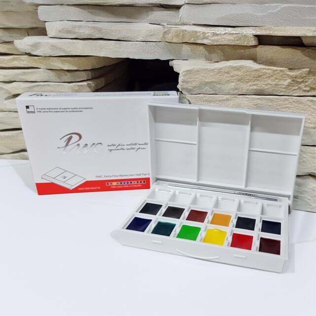 SH1215012 SH1215012 SHINHAN PWC EXTRA FINE WATERCOLOUR 12 HALF PAN COLOURS. Includes the following thoughtfully selected balanced 12 colours in removable half pans within a portable easy-to-use half pan folding palette box: Crimson Lake, Pyrrole Red, Permanent Yellow Light, Permanet Green 1, Viridian Hue, Cerulean Blue Hue, Ultramarine Deep, Permannet Violet, Yellow Ochre, Burnt Sienna, Burnt Umber and Ivory Black. Set also includes 6 well mixing palette, a travel brush plus plus a blank colour dot swatch card.. Non-toxic (AP certified) and suitable for use Indoor or Outdoor In stock Login For Price