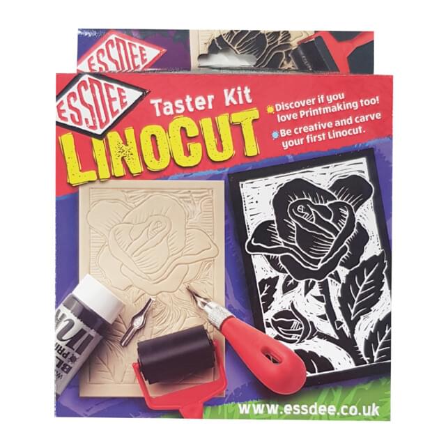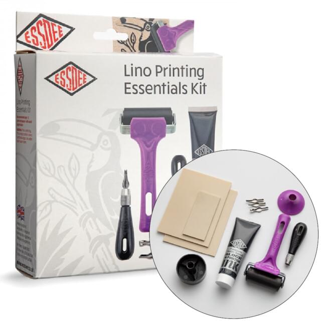 ESSDEE LINOCUT PRINTMAKING STARTER KIT. This printmaking Taster Kit is the most affordable and accessible way to try lino printing. The kit contains 2 large 10x15cm pieces of SoftCut lino, two Lino cutters, 100ml of block printing ink and an ink roller, which is enough to create loads of prints from the user's own designs. |