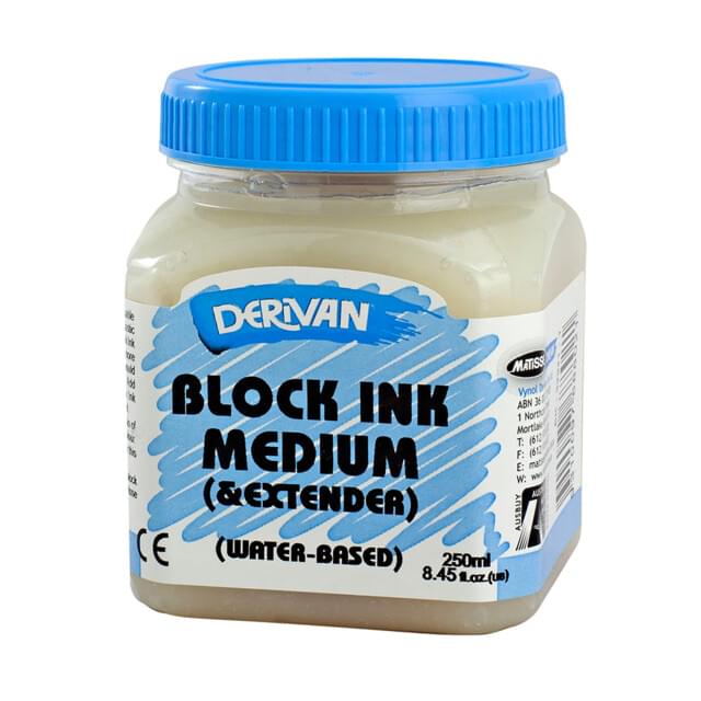 DERIVAN BLOCK PRINTING INK EXTENDER MEDIUM 250ml. Used to extend non oil-based block printing inks by adding up to 1 part medium to 1 part colour without altering the intensity of the colour. Above a 1:1 ratio, the more medium added, the more transparent the colours become. |