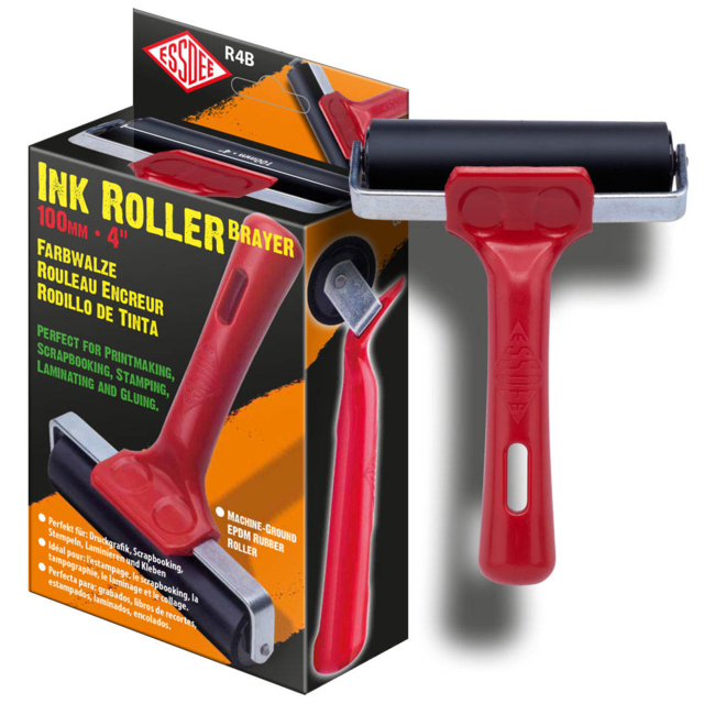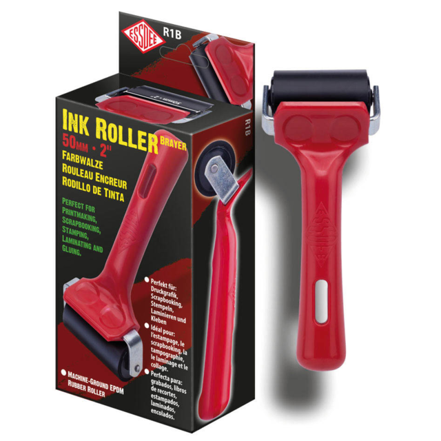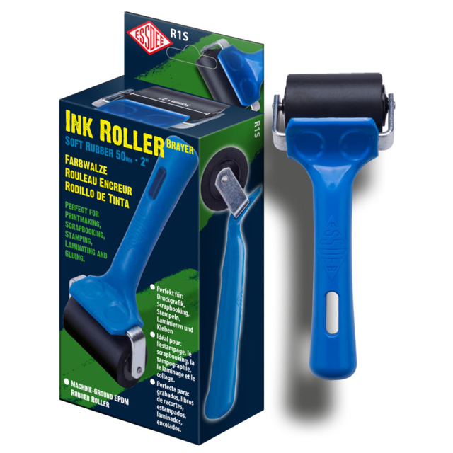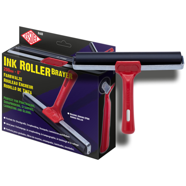 Essdee Soft Roller: Soft compound brayers (EPDM at 40 shore) designed to be more forgiving on uneven surfaces and provide more compliant coverage than hard rubber material. Especially designed for relief printing, they are resistant to printers' chemicals and are not affected by exposure to daylight. Feature easy-to-clean polypropylene handles, built in rest, rigid frame and self-lubricating Nylon bearings. NB. Care must be taken to prevent indentation to the soft surface.