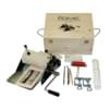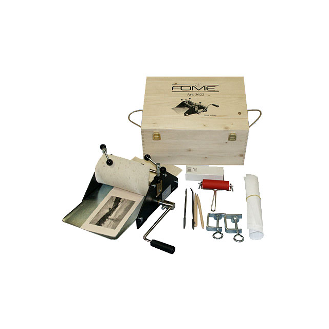 FOME SCHOLASTICO 3621 ETCHING PRESS STARTER KIT. This kit contains everything you need to get started, including a model 3620 press (19x32cm bedplate), a 3mm thick felt cushion blanket, 5 each x 1mm thick aluminium etching plates (90 x 120mm, 130 x 180mm), 1 rubber ink brayer, 1 tube of black etching ink, 1 each etching point/scraper and burnisher/scraper solid steel etching tools, 2 wooden handled dry point tools, 5 sheets of tarleton ink wiping cloth, 2 desk clamps and basic instruction book.Packaged in a sturdy wooden storage box complete with carry handles. |