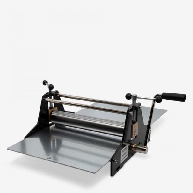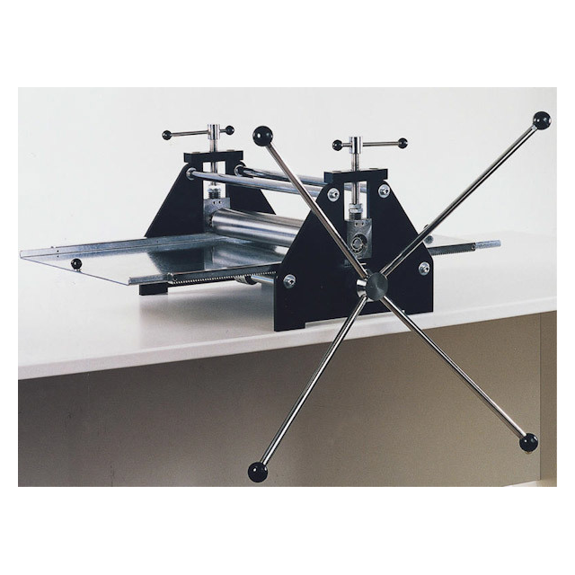 FOME ETCHING PRESS WITH 32x60cm STEEL BEDPLATE. A compact beginner/student press featuring 4mm thick steel frame uprights, solid steel 50mm diameter upper and 40mm diameter lower roller which allow plates/blocks with a thickness up to 20mm to pass through. Pressure is regulated by means of the regulating screws. The 32x60x0.3mm thick galvanised steel bedplate is supplied with safety end stops and a cushion blanket. This press enables printing on papers up to A3 in size and is supplied with metal clamps to secure the press to the worktop if required. Weight 17kg. Dimensions (excluding bedplate) 42cmW x 30cmL x 23cmH