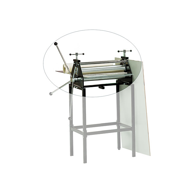 FOME SCHOLASTICO ETCHING PRESS + BEDPLATE 26x42cm. At last, a true beginner's press! Extremely compact with 4mm thick steel uprights. The rollers are solid steel and move on bushes. The lower knurled roller is driven by a (removable) handle. The upper roller is fixed to two brass runners connected to the regulating screws, which allow plates/blocks with a thickness up to 20mm to pass through the rollers. Pressure is regulated by means of the regulating screws whose special system of elastic steel rings ensure the right amount of flexibility in the printing pressure. The galvanised steel bed is guided by lateral uprights and is included with the press. N.B. Blankets to be ordered separately. |