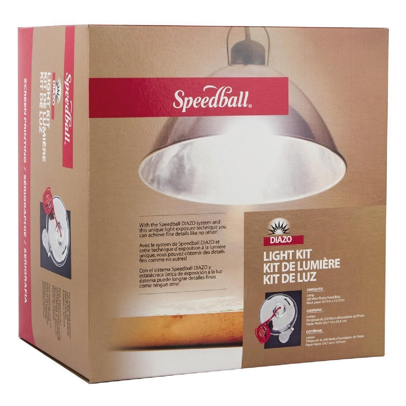 This light kit is specifically designed for exposing screens using the Speedball Diazo Photo Emulsion process. The kit comprises 260mm wide x 185mm high polished aluminium reflector fitted with a ceramic bulb holder to accept the Edison screw 250 watt/110 volt Photo Flood Bulb (replacement item code SPEB4518) supplied. The reflector includes a wire support bracket by which the unit can be hung at the appropriate height (refer to exposure chart on underside of packing box) and is supplied with a heavy duty 1.8m power cord fitted with a USA two pin power plug for connection only to the step-down power supply.