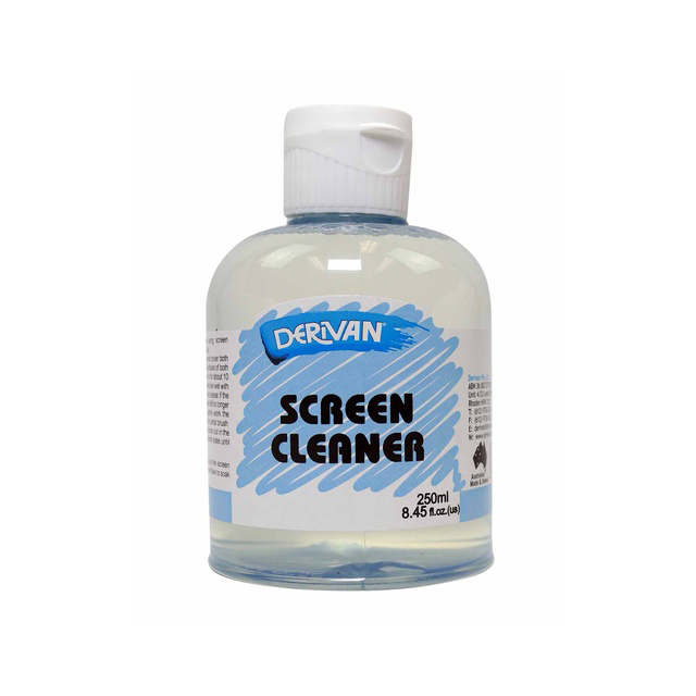 DERM250PG DERM250SC DERIVAN SCREEN MESH CLEANER 250ml. NB.Use to clean off Derivan Screen Block Out from printmaking silk screens. Apply generously with a wet sponge covering both sides of the screen and leave for five minutes. This gives the cleaner chance to absorb and break down the Derivan Screen Block Out from the fibres of the screen mesh. After five minutes use an old toothbrush to work away at the screen. Rinse the screen with cold water and leave to dry. It is advisable when using Derivan Screen Cleaner to wear protective clothing, eyewear and gloves. Available soon Login For Price