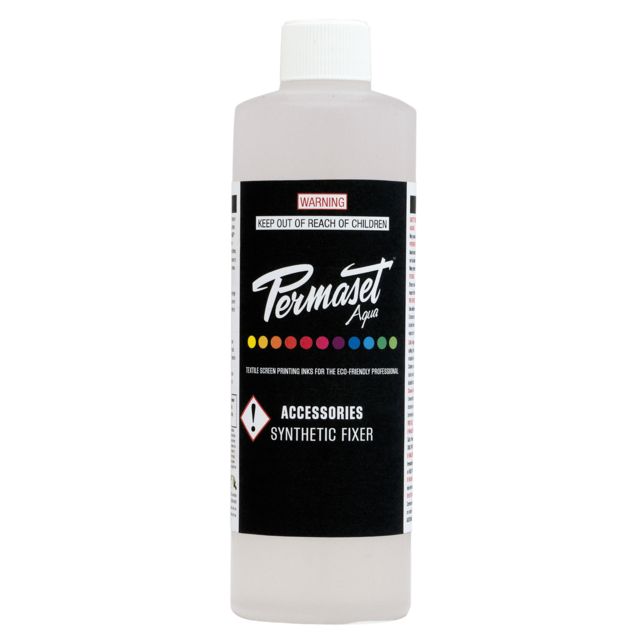 #COLORMAKER PERMASET SYNTHETIC FABRIC FIXER 500ml. Synthetic fixer is an additive for Permaset print pastes or fabric printing colours which markedly improves adhesion to synthetic materials such as poly/cotton blends, polyester or acrylic fibres. In addition, Synthetic Fixer improves the rub resistance of cured paints as well as the washability. Please note item with descriptions pre-fixed # are special order products and generally available within a few days following receipt of your order. |