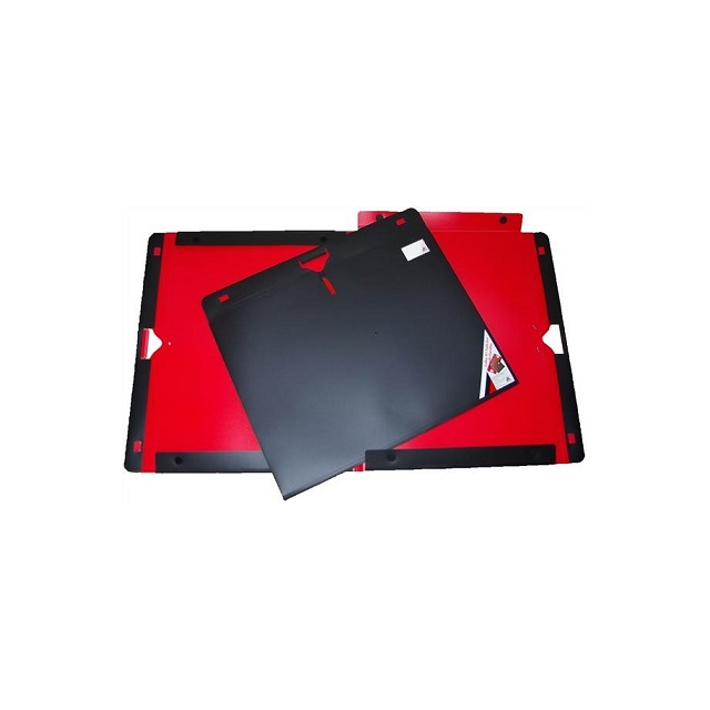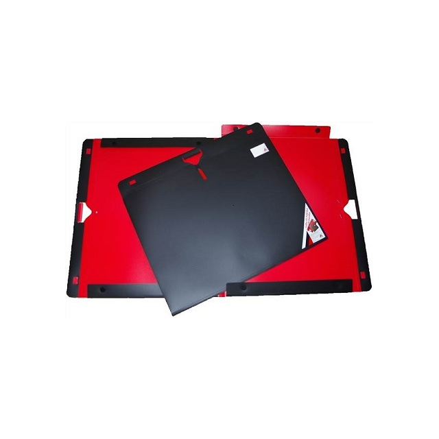 COLBY FOLD OUT CARRY CASE A1. Made from a single sheet of co-extruded, copy safe and acid free polypropylene, black outside and red inside.Scored internal flaps form up into 30mm deep storage pockets.A1 folds out to A0. Die-cut handle, business card window and hat elastic with button closure.Made from archival quality, copy safe, acid free polypropylene. |