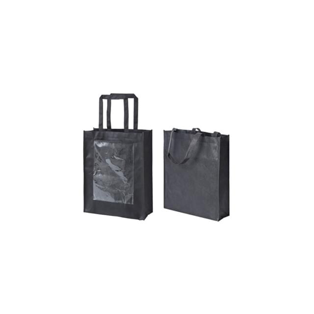 BLACK ECO BAG WITH EXTRA PVC DISPLAY/STORAGE POCKET Pk10. Handy 2 handled Eco bag with a gusset. Includes an A4 plastic pocket to hold artwork. Ideal for art kits, presentations and awards. Dimensions are 42cm(h) x 34cm(w) x 12cm(d). |